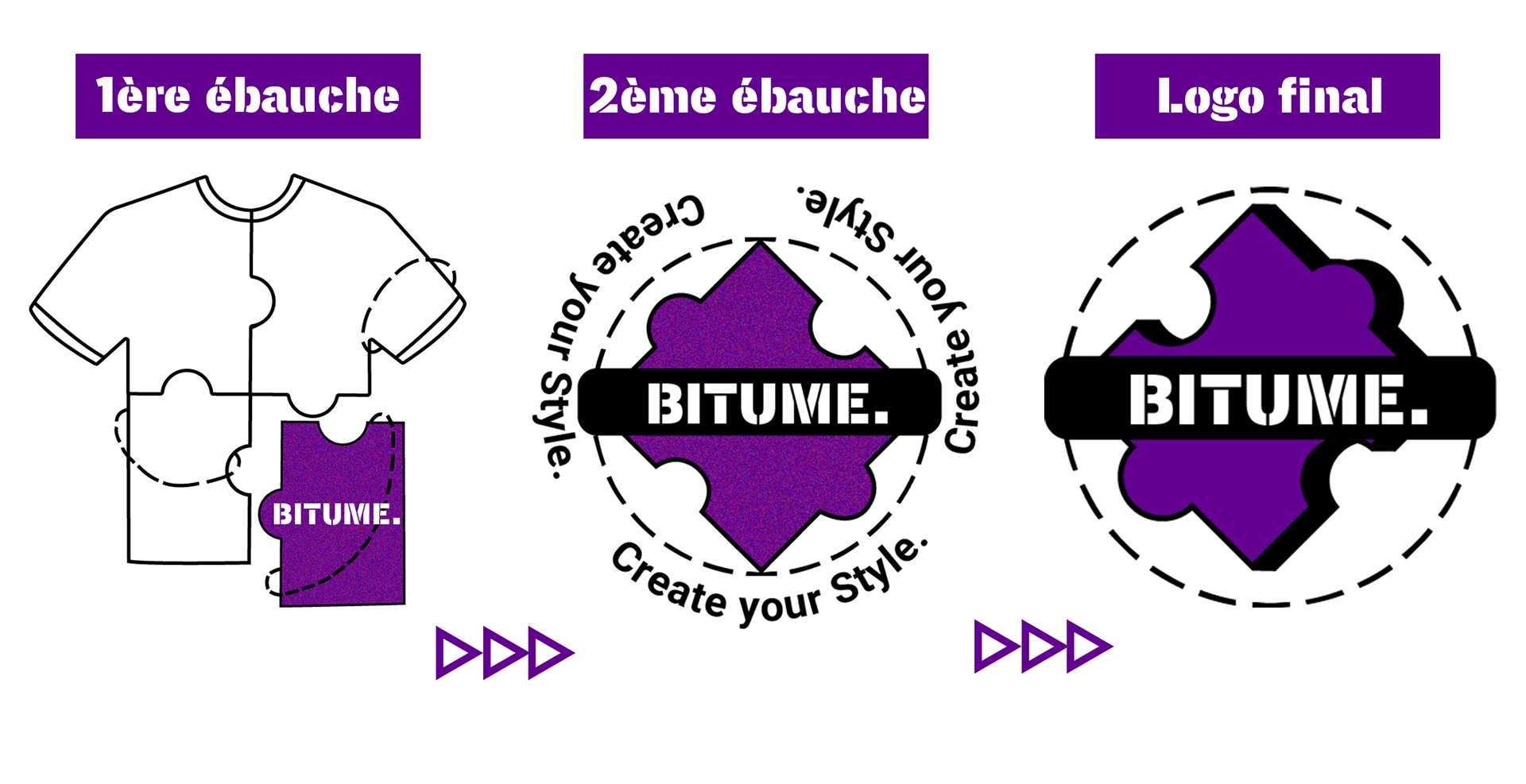Concernant les logos, nous avons fonctionné par une approche itérative : chaque logo réalisé était présenté au reste du groupe pour validation jusqu'à trouver le logo le plus efficace et évocateur. Dès le début du projet, nous avons adopté l'imagerie de la pièce de puzzle, symbolisant la création progressive des tenues vestimentaires de l'abonné, alliée à la couleur violette, teinte représentant la créativité et l'inspiration.