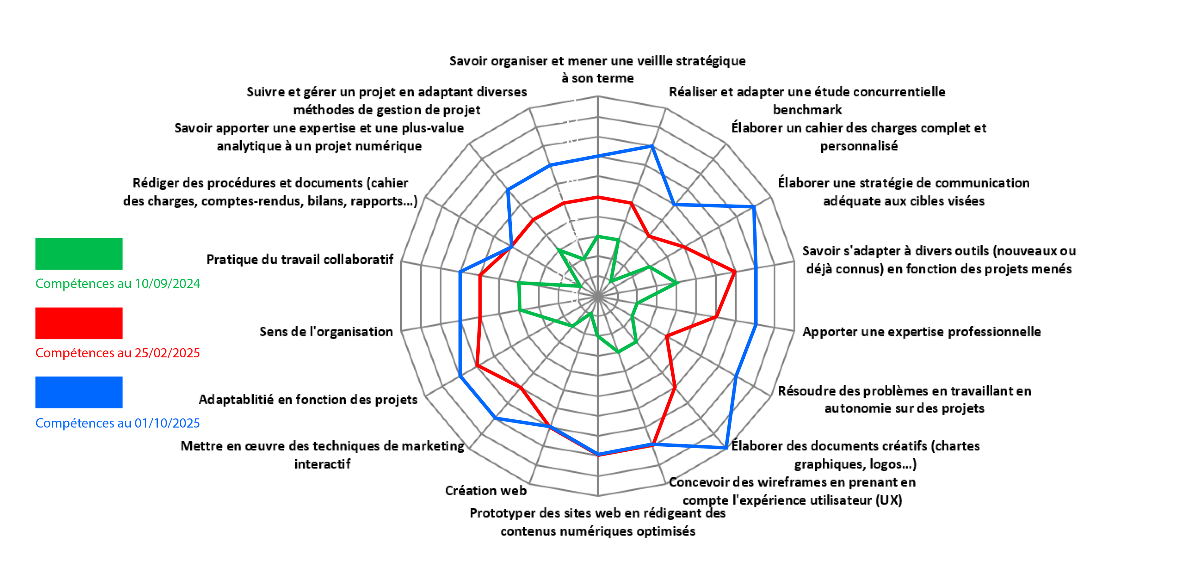 À l'issue de ce stage, j'ai pu me concentrer sur mon profil professionnel en réalisant un radar de compétences, disponible ci-dessous, comprenant trois temps forts afin de constater, humblement et avec du recul, de mes améliorations dans divers domaines communicationels selon mon propre ressenti. Ainsi, le premier temps fort, en vert, correspond à mon entrée en master 1 ; le second temps fort, en rouge, correspond à mon entrée en stage de M2 ; et le dernier temps fort, en bleu, correspond à mes compétences en sortant de stage et en terminant mon master. Certaines compétences, moins travaillées en stage, ont moins évolué que d'autres en raison du contexte de mon stage et des missions qui m'ont été déléguées qui ne m'ont pas forcément permis de travailler tous les axes présents sur ce radar.